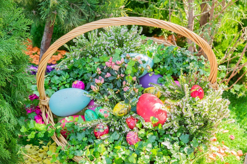 Пасхальное уличное украшение. Плетеная корзина с расписными пасхальными яйцами, тортом и цветами