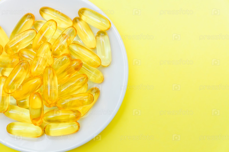 Капсулы рыбьего жира в белой тарелке на желтом фоне. Вид сверху, плоская планировка, пространство для копирования