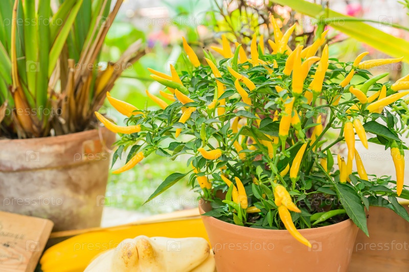 Маленькие желтые перцы халапеньо растут в глиняных горшках. Фермерские органические овощи
