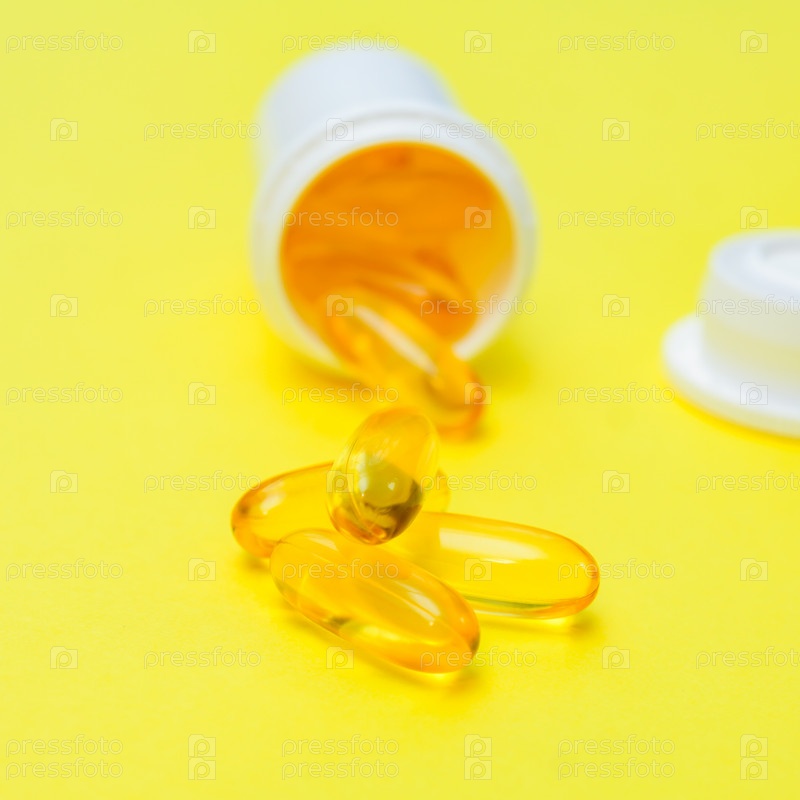 Гелевые капсулы с рыбьим жиром омега-3 на желтом фоне. Креативная концепция здравоохранения