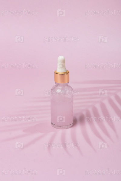 Стеклянная косметическая бутылка-капельница с косметическим маслом или сывороткой для ухода за кожей на розовом фоне. Концепция естественного ухода за кожей. Жесткие тени пальмы