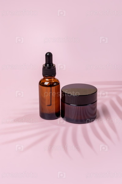 Набор средств по уходу за кожей на пустой упаковке из янтарного стекла на розовом фоне. Концепция лечения лица и тела. натуральная косметика, макет с тенью пальмы