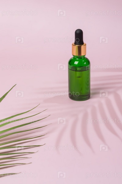 Косметическая бутылка сыворотки, масло на зеленой ветке на розовом фоне. Концепция натуральной косметики, средство по уходу за кожей. Концепция красоты для ухода за телом лица. Макет