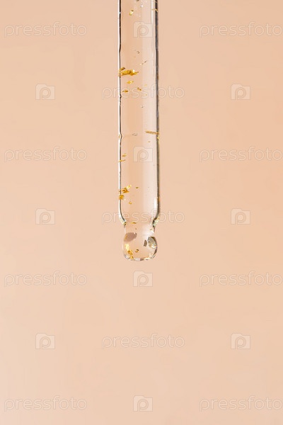 Пипетка крупным планом с гиалуроновой увлажняющей сывороткой из 24-каратного золота на бежевом фоне. Концепция ухода за кожей красоты Красота и спа