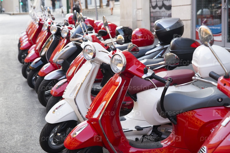 Италия. Рим. Мотороллеры Веспа в салоне проката скутеров. Италия. Рим. Vespa scooters in the scooter rental salon