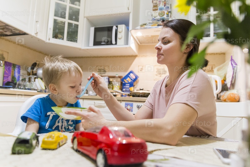 Россия. Санкт-Петербург. Семейный завтрак. Мать кормит ребенка кашей. Россия. Санкт-Петербург. Семейный завтрак. Мама кормит малыша кашей