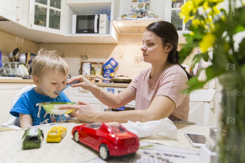 Россия. Санкт-Петербург. Семейный завтрак. Мать кормит ребенка кашей. Россия. Санкт-Петербург. Семейный завтрак. Мама кормит малыша кашей