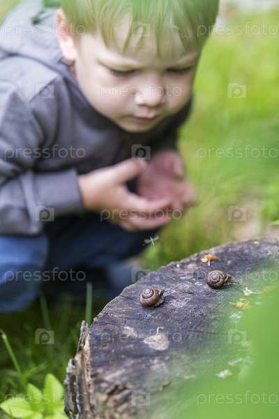 Россия. Санкт-Петербург. Ребенок интересуется насекомыми. Мальчик смотрит на улитку. Россия. Санкт-Петербург. Ребёнок заинтересован в насекомых. Мальчик смотрит на улитку