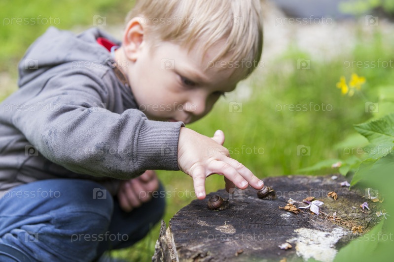 Россия. Санкт-Петербург. Ребенок интересуется насекомыми. Мальчик смотрит на улитку. Россия. Санкт-Петербург. Ребёнок заинтересован в насекомых. Мальчик смотрит на улитку