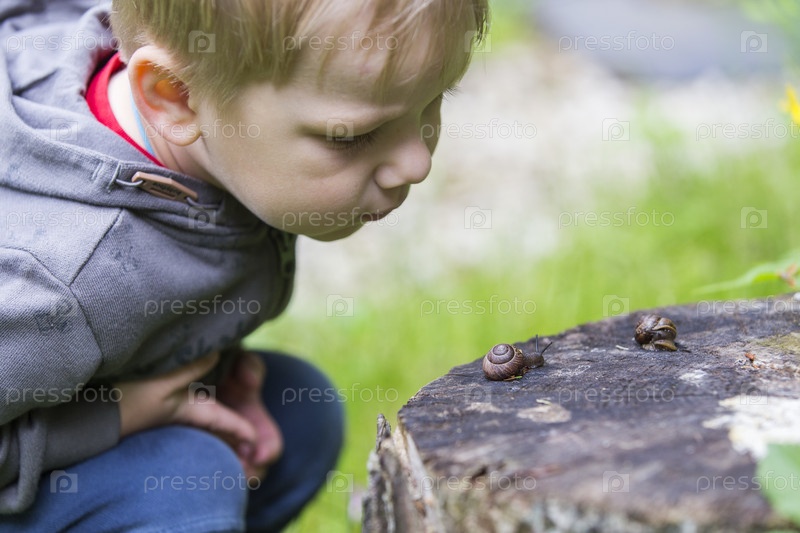 Россия. Санкт-Петербург. Ребенок интересуется насекомыми. Мальчик смотрит на улитку. Россия. Санкт-Петербург. Ребёнок заинтересован в насекомых. Мальчик смотрит на улитку