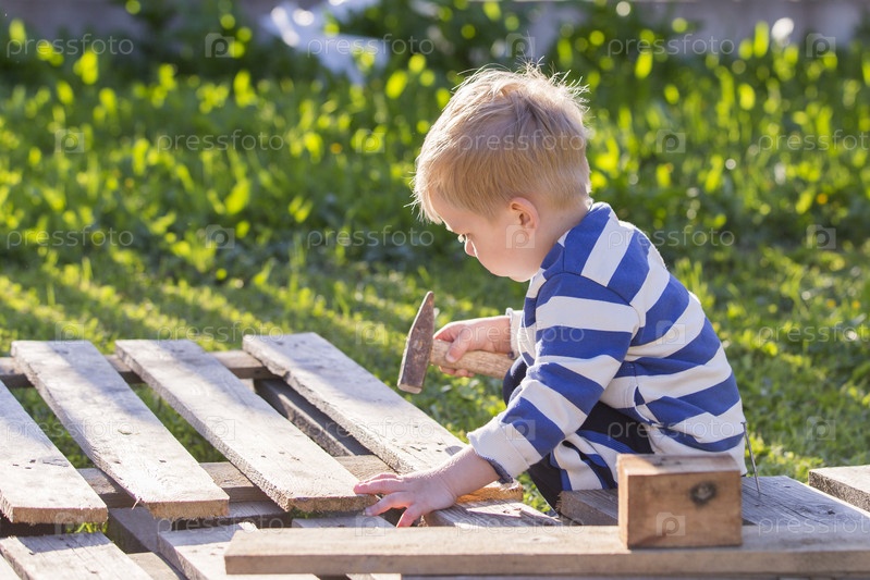 Россия. Санкт-Петербург. Детский загородный отдых. Мальчик держит молоток. Россия. Санкт-Петербург. Детское сельское досуг. Мальчик держит молот