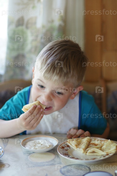 Россия. Ленинградская область. Мальчик ест блины. Завтрак. Россия. Ленинградский регион. Мальчик ест блинчики. завтрак