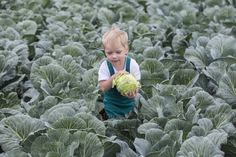 Россия. Ленинградская область. Капуста в поле. Урожай капусты. Мальчик собирает капусту. Ребенок с косой головой на косовом поле