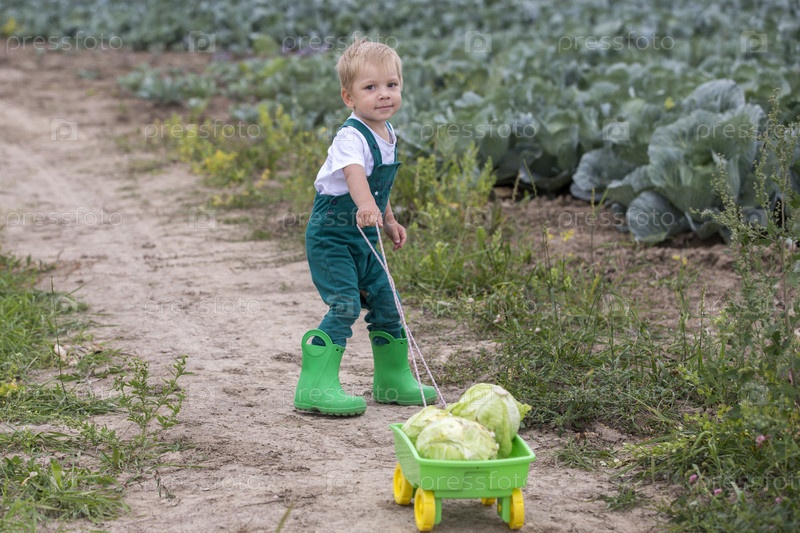 Россия. Ленинградская область. Капуста в поле. Урожай капусты. Мальчик собирает капусту. Ребенок с косой головой и тележкой на косом поле