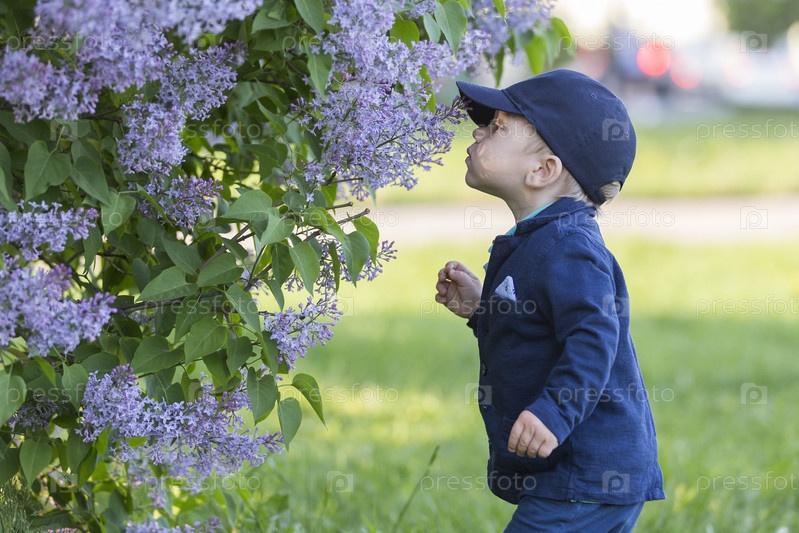 Россия. Санкт-Петербург. Мальчик нюхает в саду цветы сирень. Россия. Санкт-Петербург. Мальчик нюхает лиловые цветки в саду
