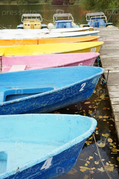 Россия. Санкт-Петербург. Прогулочные лодки. Лодки для водных прогулок у пристани в парке. Россия. Санкт-Петербург. Привлекательные лодки. Лодки для водных прогулок на пирсе в парке