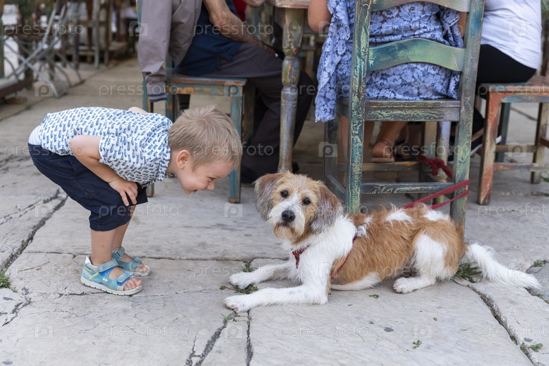 Италия. Террачина. Маленький мальчик смотрит на собаку, привязанную к веревке. Италия