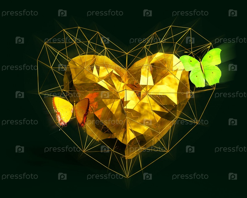 Сердце в низкополигональном стиле с желтым светом и бабочками