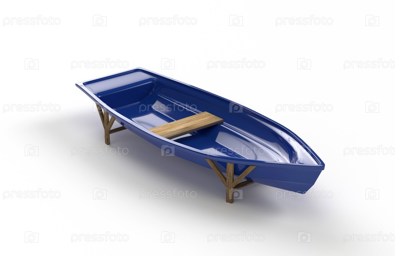 Синяя пластиковая рыбацкая лодка с скамейкой, которая стоит на опорах на белом фоне. 3d визуализация