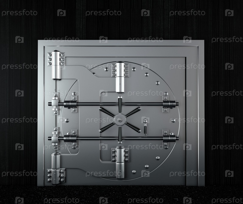 Вид спереди на хромированную дверь банковского хранилища, закрытую. 3D визуализация