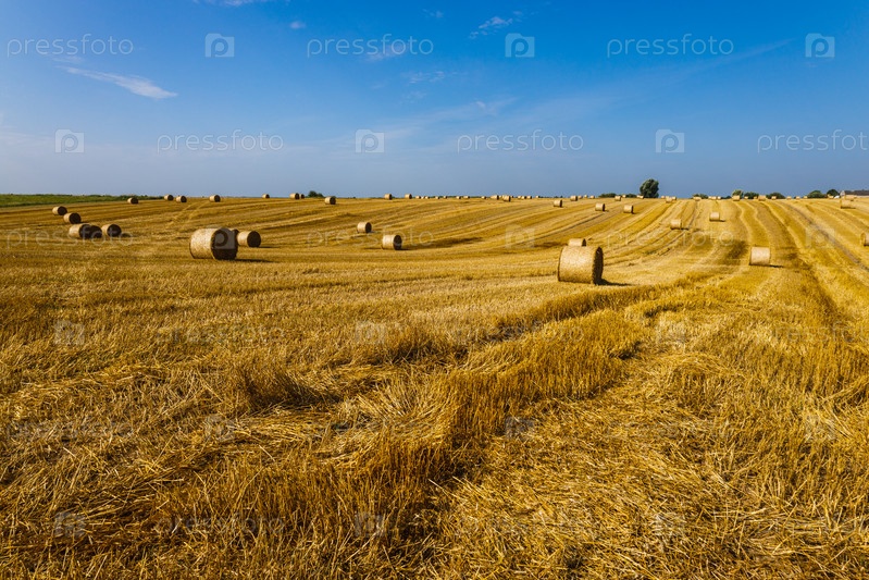 Поле сельского хозяйства после сбора урожая с большими тюками сена на пшеничном поле