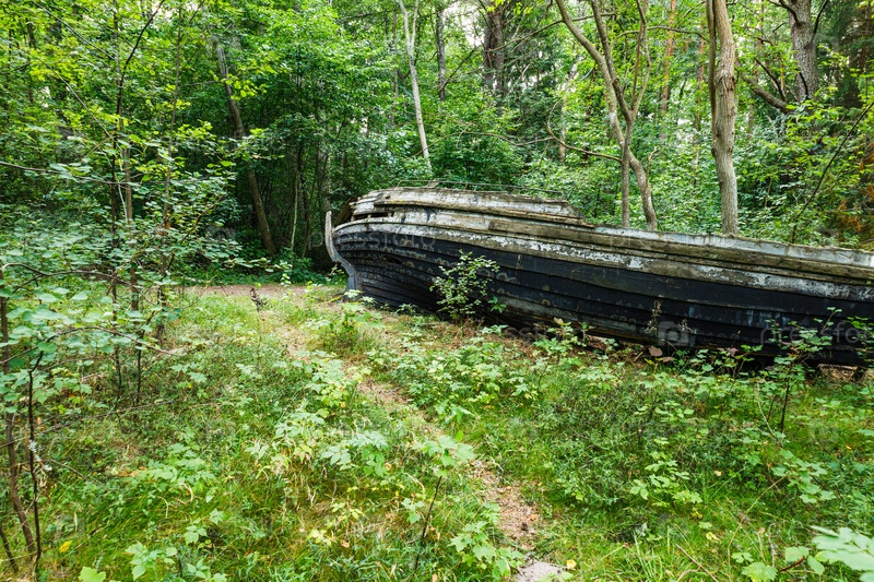 Старая заброшенная деревянная рыбацкая лодка в лесу. Кладбище лодок у Балтийского моря в Латвии