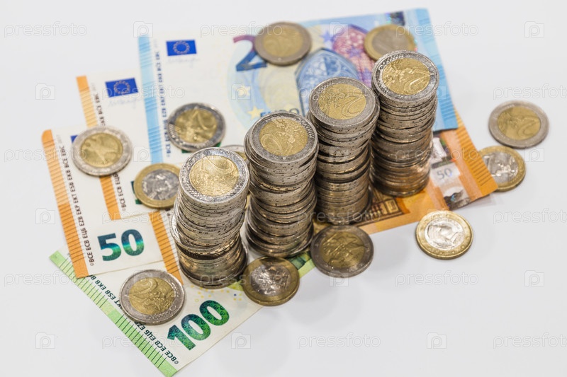 Банкноты евро и сложенные монеты. Финансы, банковские деньги, концепция и экономия энергии