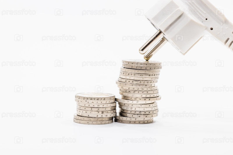 Стек возрастающих монет и электрическая вилка. Концепция повышения цен на электроэнергию
