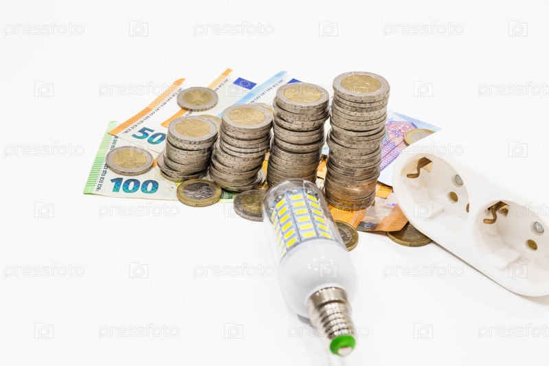 Лампочка, электрическая вилка и банкноты евро. Концепция увеличения затрат на энергию