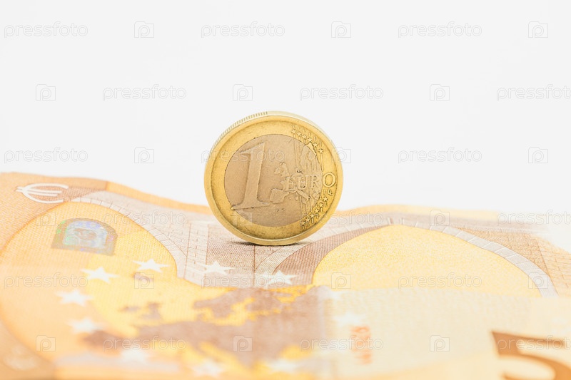 Монета в один евро на банкноте номиналом в пятьдесят евро