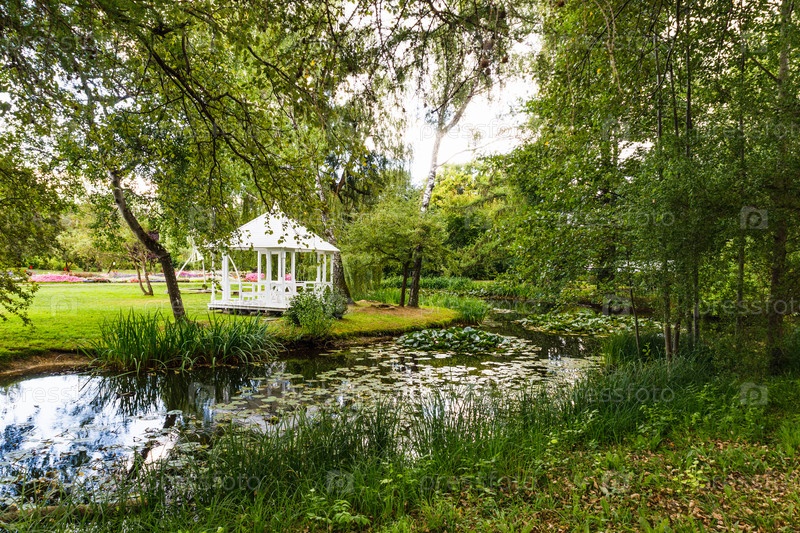 Живописный вид на городской парк с зелеными деревьями и прудом