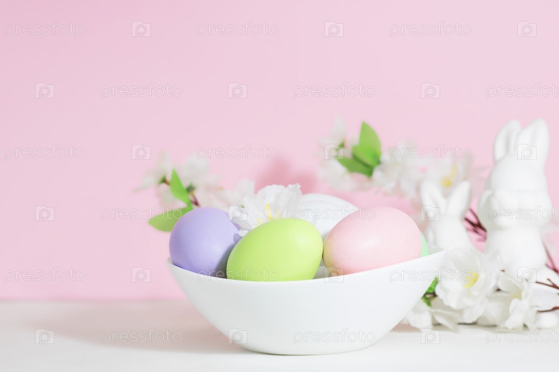 Пасхальные яйца, розовые, зеленые и сиреневые, в белой тарелке, рядом с кроликами и цветами на розовом фоне. Пастельные тона
