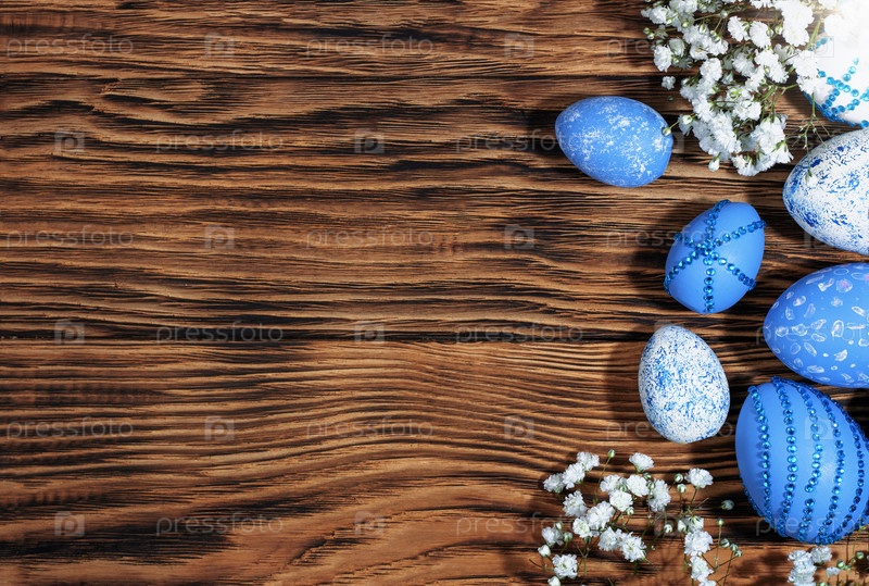 Синий и белый, со стразами, пасхальные яйца, разбросанные по модному желтому деревянному фону с цветами. Минимальная концепция Пасхи. Вид сверху. Пасхальная открытка с местом для копирования текста