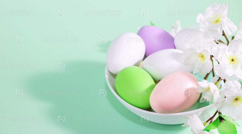 Пасхальные яйца, розовые, зеленые и сиреневые, в белой тарелке, рядом с цветами на зелено-голубом фоне. Пастельные тона. Пасхальная открытка. Вид сверху. Копировать пространство