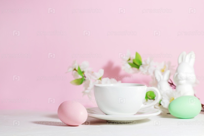 Белая кружка с чаем или кофе рядом с розовыми и зелеными пасхальными яйцами, кроликами и цветами, на бетонном белом столе, на розовом фоне, с жесткими тенями. Концепция пасхального завтрака