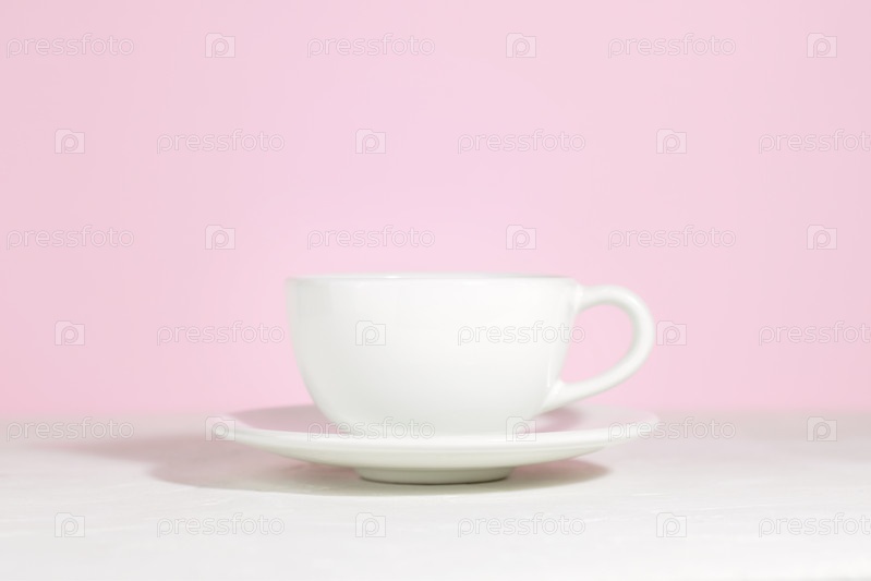 Белая кружка с чаем или кофе на блюдце, на бетонном столе, на розовом фоне. Жесткие тени