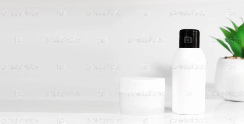 Бутылки косметики по уходу за кожей на белом фоне, с зеленым растением. Косметика весеннего сезона. Ежедневная косметика. Макет рекламы косметики. Баннер. Копировать пространство