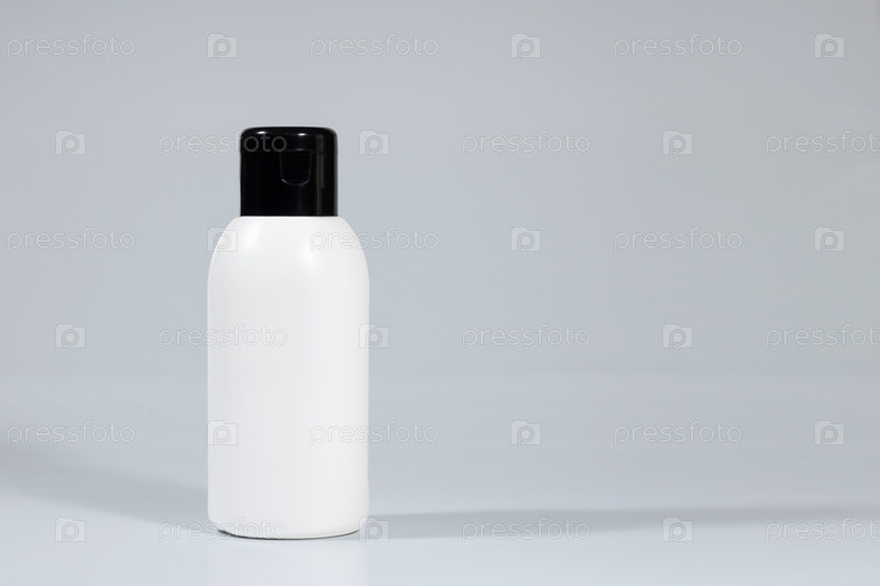 Косметическая бутылка по уходу за кожей на белом сером фоне. Ежедневная косметика. Макет рекламы косметики. Баннер. Копировать пространство