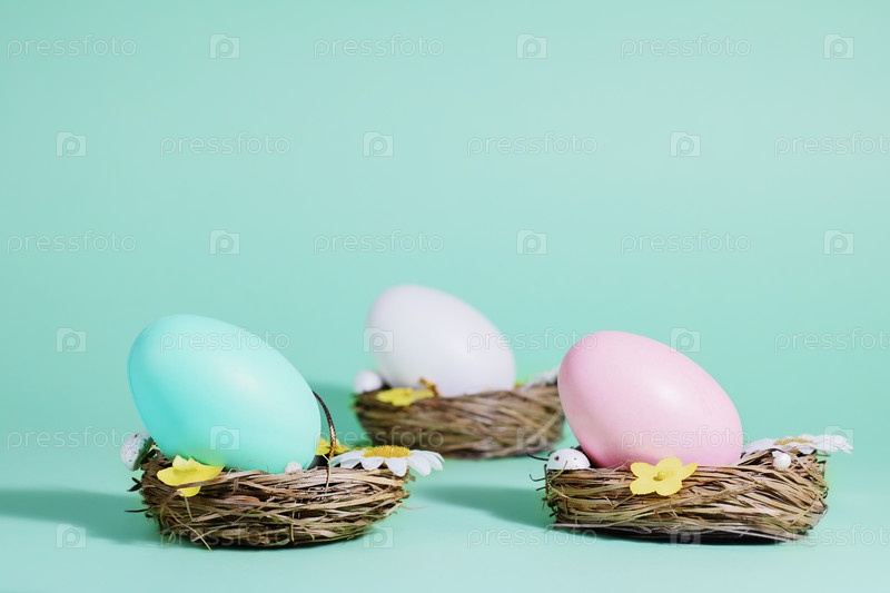 Пасхальный фон. Пасхальные яйца в корзинах гнезд на сине-зеленом фоне, в пастельных тонах