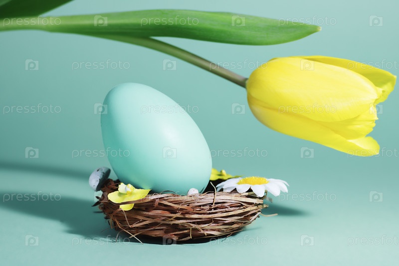 Пасхальный фон. Пасхальное яйцо в гнездовой корзине на сине-зеленом фоне с желтым весенним цветком тюльпана