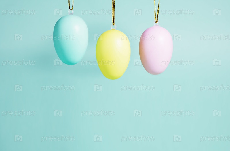 Пасхальный фон. Коллекция пасхальных яиц в пастельных тонах, висящих на сине-зеленом фоне. Пасхальная концепция