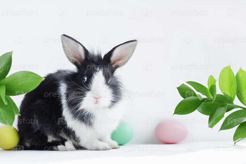 Пасхальный кролик с желтым, розовым и зеленым яйцом на бело-сером фоне с зелеными листьями. Концепция праздника Пасхи. Скопируйте пространство
