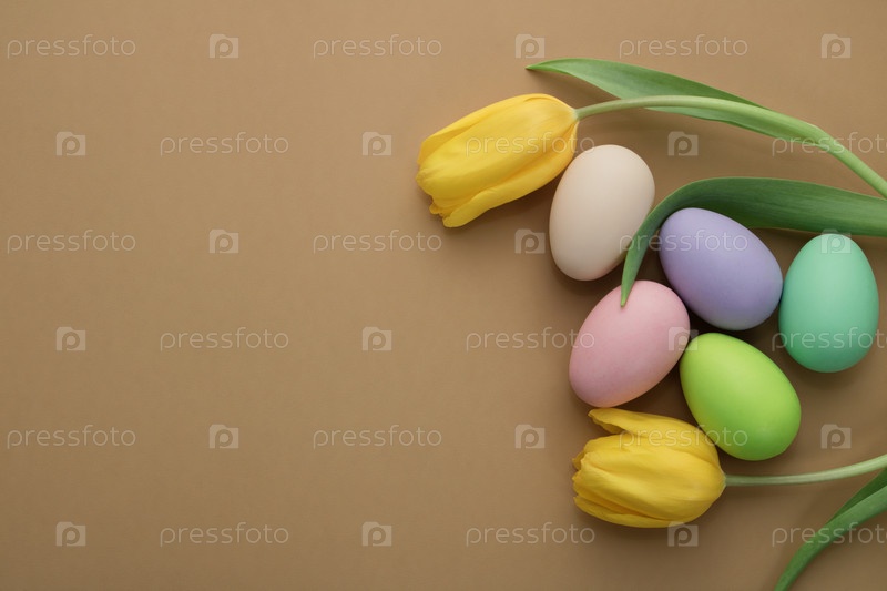 Бежевый фон с зелеными, розовыми, светло-зелеными, сиреневыми, белыми и бежевыми пасхальными яйцами и красивыми желтыми тюльпанами. Красочные пасхальные яйца. Вид сверху. Скопируйте пространство