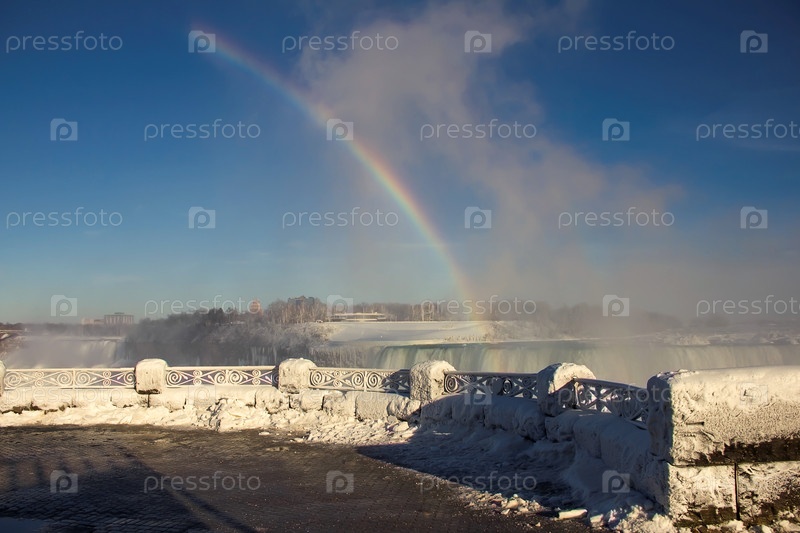 Декоративный железный забор, покрытый толстым слоем замерзшего тумана. Ниагарский водопад на заднем плане