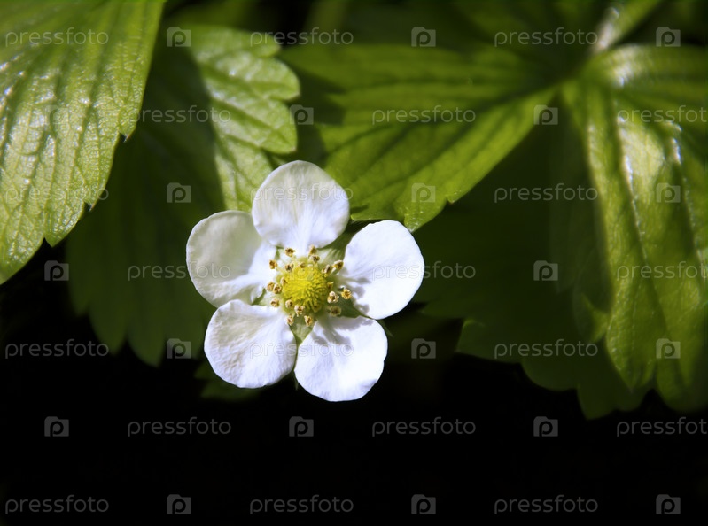 Сохранить Скачать Превью Цветы клубники с листьями на черном фоне стебля