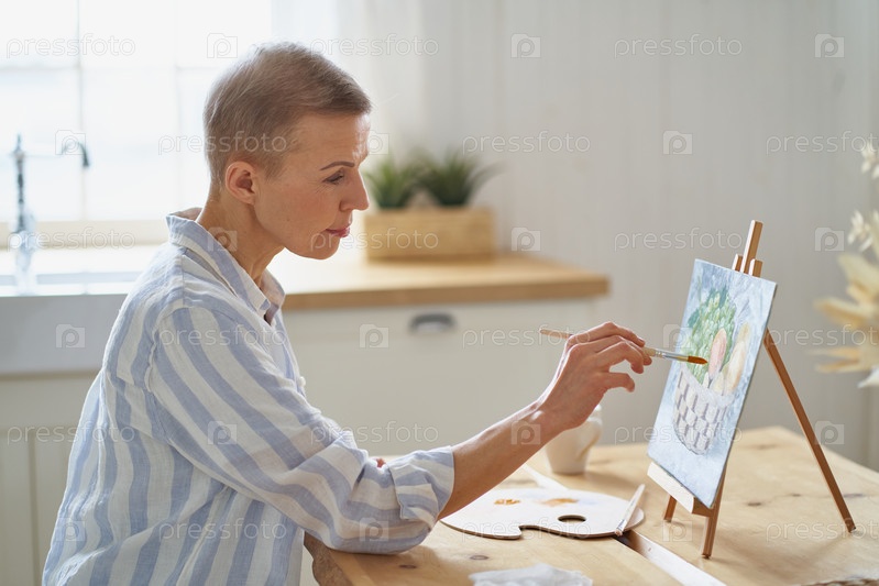 Творческая женщина средних лет рисует картину дома, сидя за деревянным столом на кухне