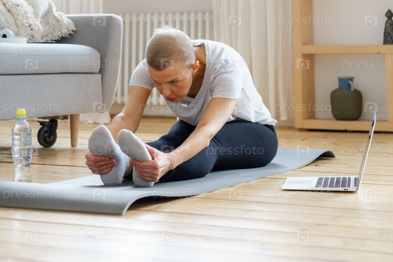 Пожилой старик протягивает руки к ногам. Балансирующие упражнения йоги, велнес для пенсионерки