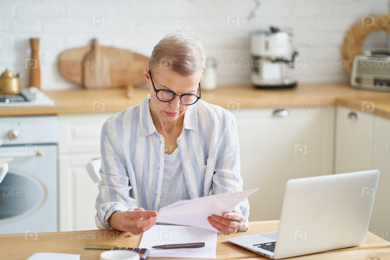 Сосредоточенная пожилая женщина в очках, работающая с документами, сидя на современной кухне