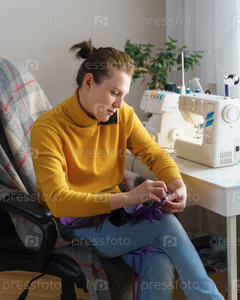 Занятая швея разговаривает по мобильному телефону во время шитья одежды на своем рабочем месте дома