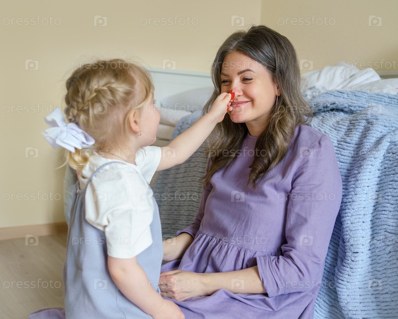 Малыш играет с магнитной строительной игрушкой, сидя на кровати